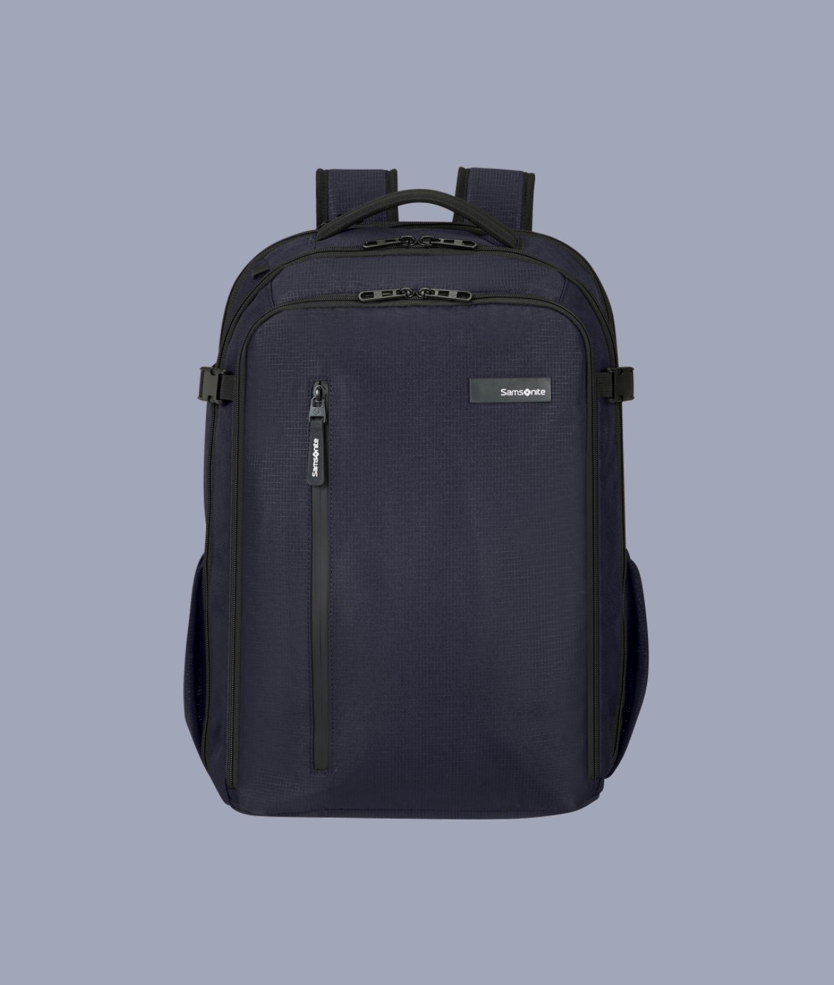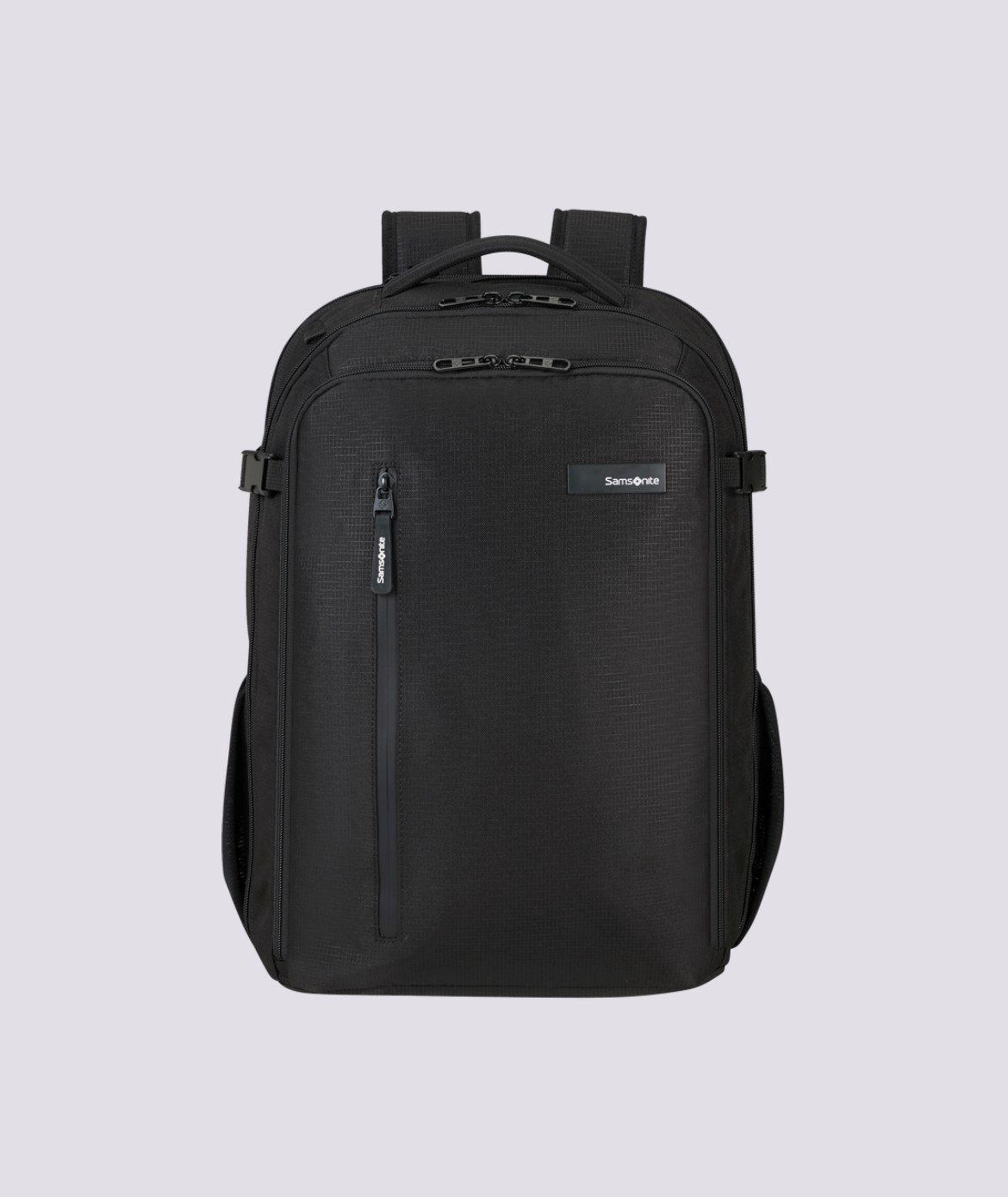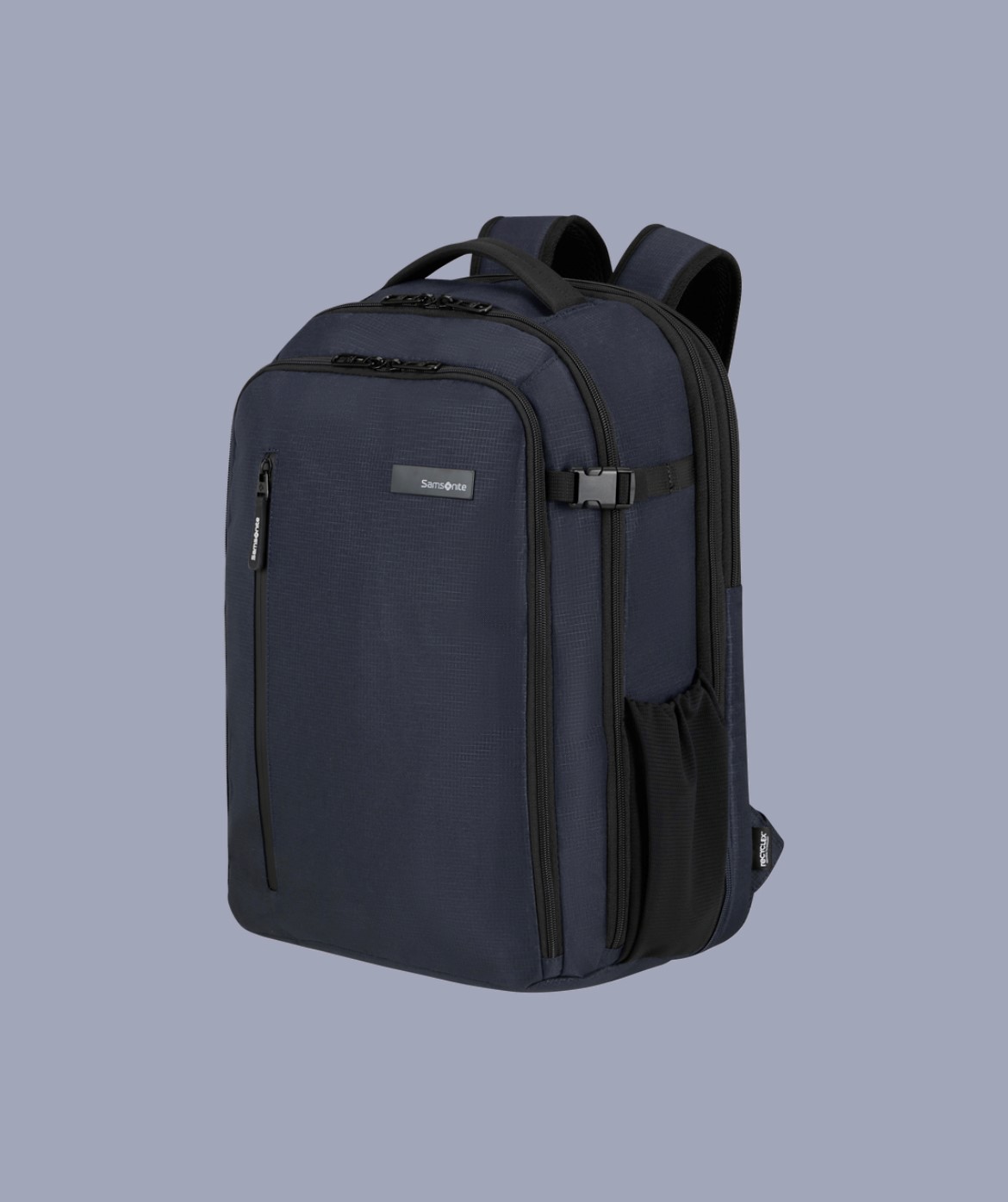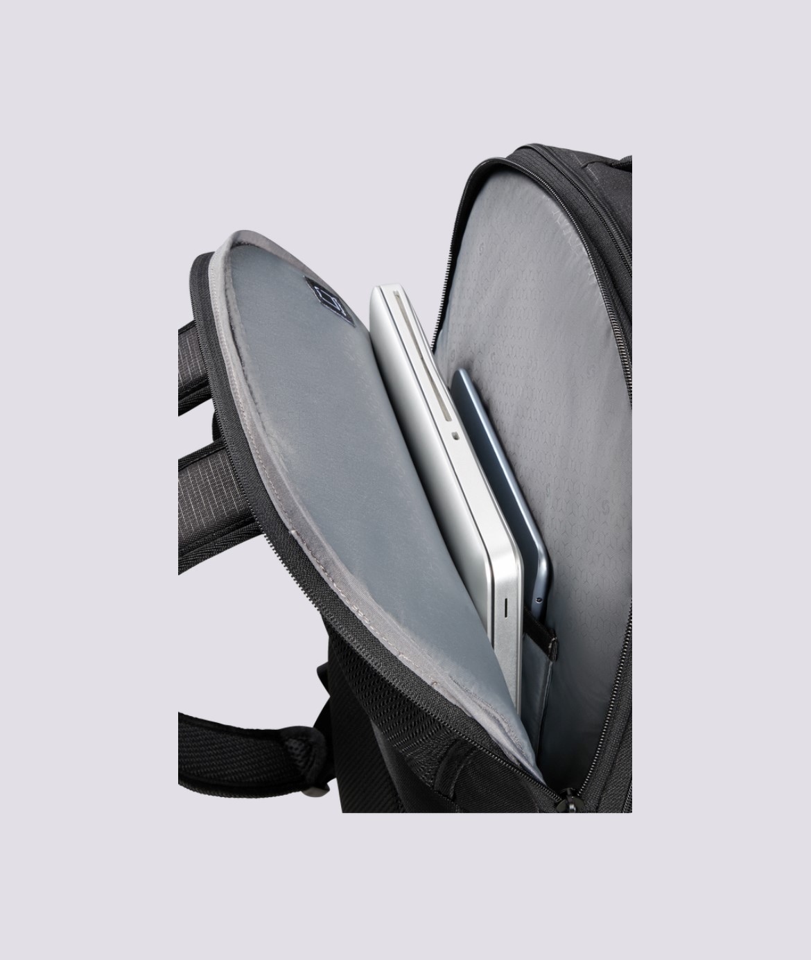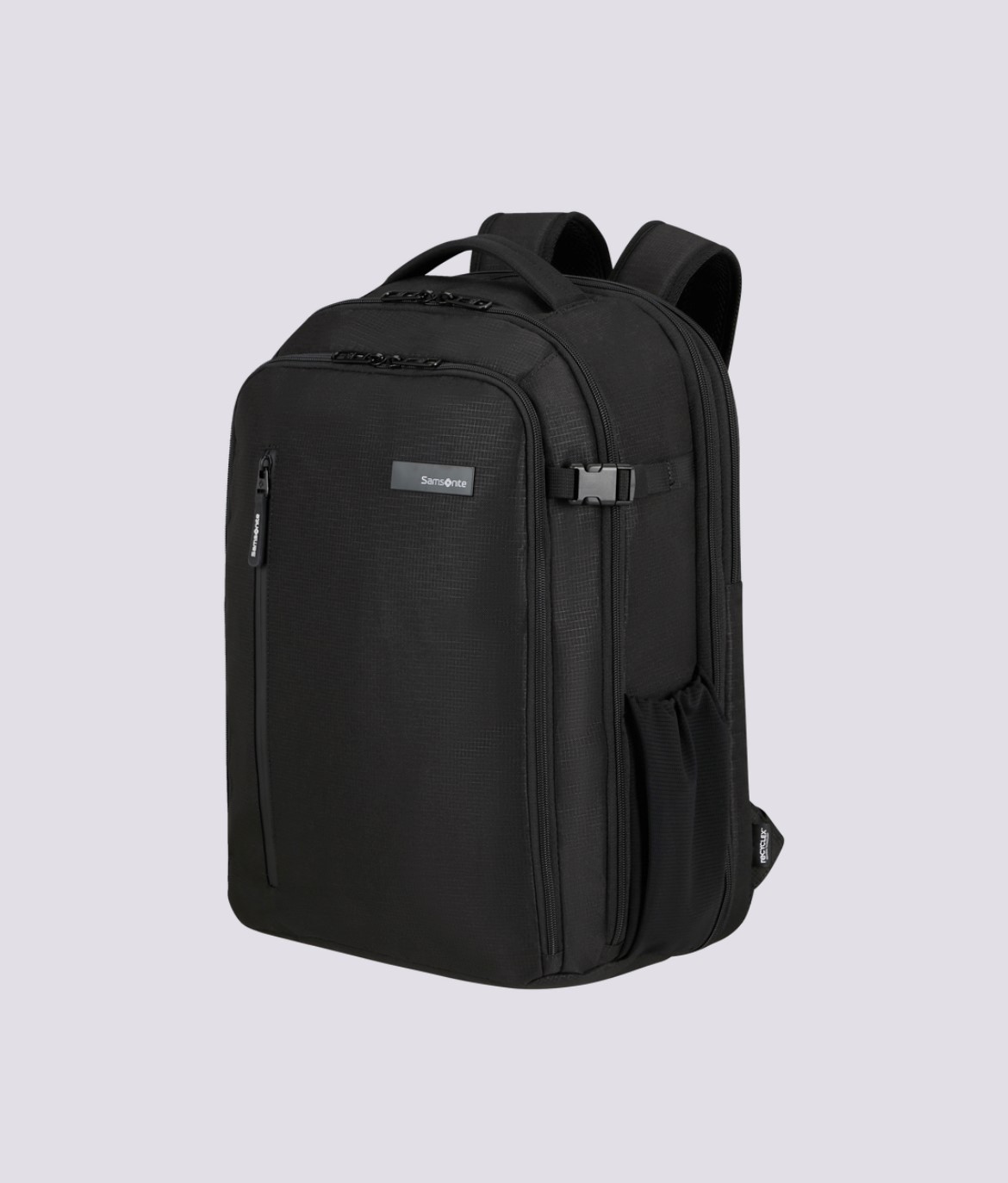 Backpack L in tessuto tecnico impermeabile chiuso da zip 2 scomparti e vano per pc 17,3'' ed entrata USB con cavo. Dimensioni: 46x35x22/26 cm con espansione. Capacità: 31,5/39,5 L Peso: 1,1 kg